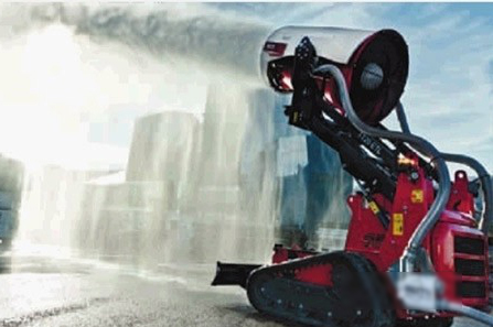 该灭火机器人是一种创新涡轮机,它能将高达3500升/分钟的水流喷成雾状小液滴,将液滴喷射到很远的距离,通过这种细雾化和长距离分布,可直接用高效水障或者厚水层直接作用于需要冷却的燃烧物上,即可达到高效的冷却作用。同时,通过液滴形成的巨大水面以及水雾形成的巨大体积,结合传统的泡沫浓缩液,形成泡沫层,使之直接轻轻地施加到燃烧的流体上,达到高效灭火的效果。